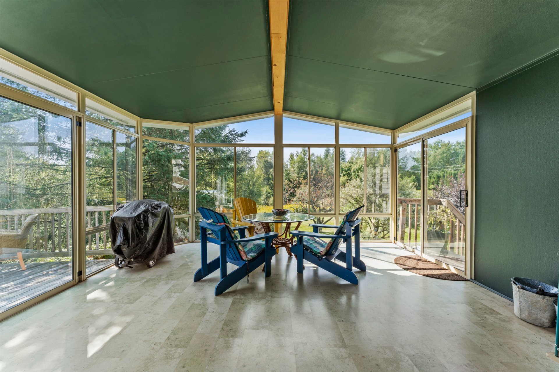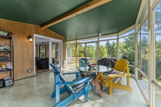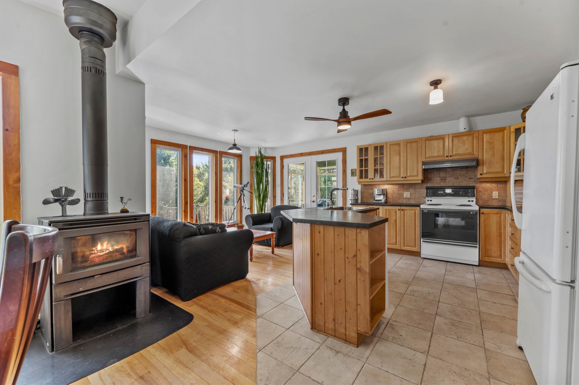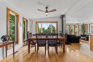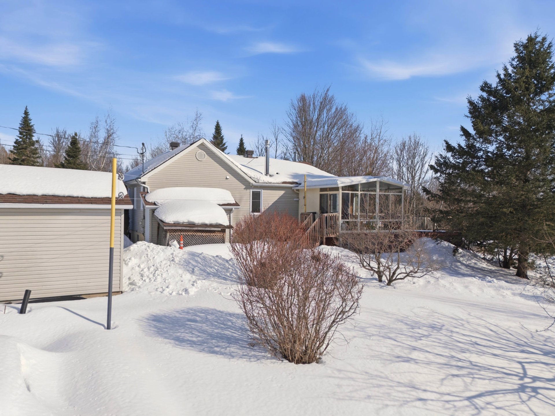 Inclus : Abri d'auto amovible (2), électroménagers, micro-onde, ensemble de meubles de la salle à manger (9), divan noir du salon (2), chaises (3) et table du solarium, étagères (2) du solarium, étagère de la chambre froide, bibliothèques (2) de la salle familiale au sous-sol, chaise verte au sous-sol, accessoires du poêle à bois, luminaires, ventilateurs de plafond (2), habillages de fenêtres, barres de protection dans certaines fenêtres du sous-sol.